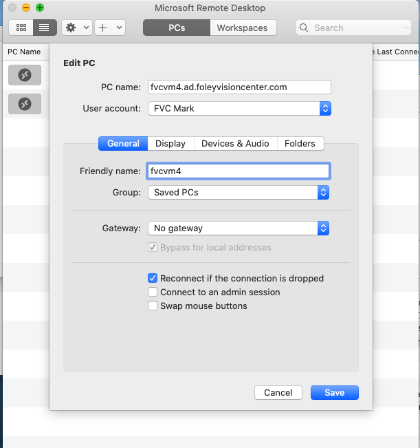 This guide covers how to get you connected to the new server at FVC. We will use an existing entry for the old server, duplicate & customize the new entry, then test the connection.