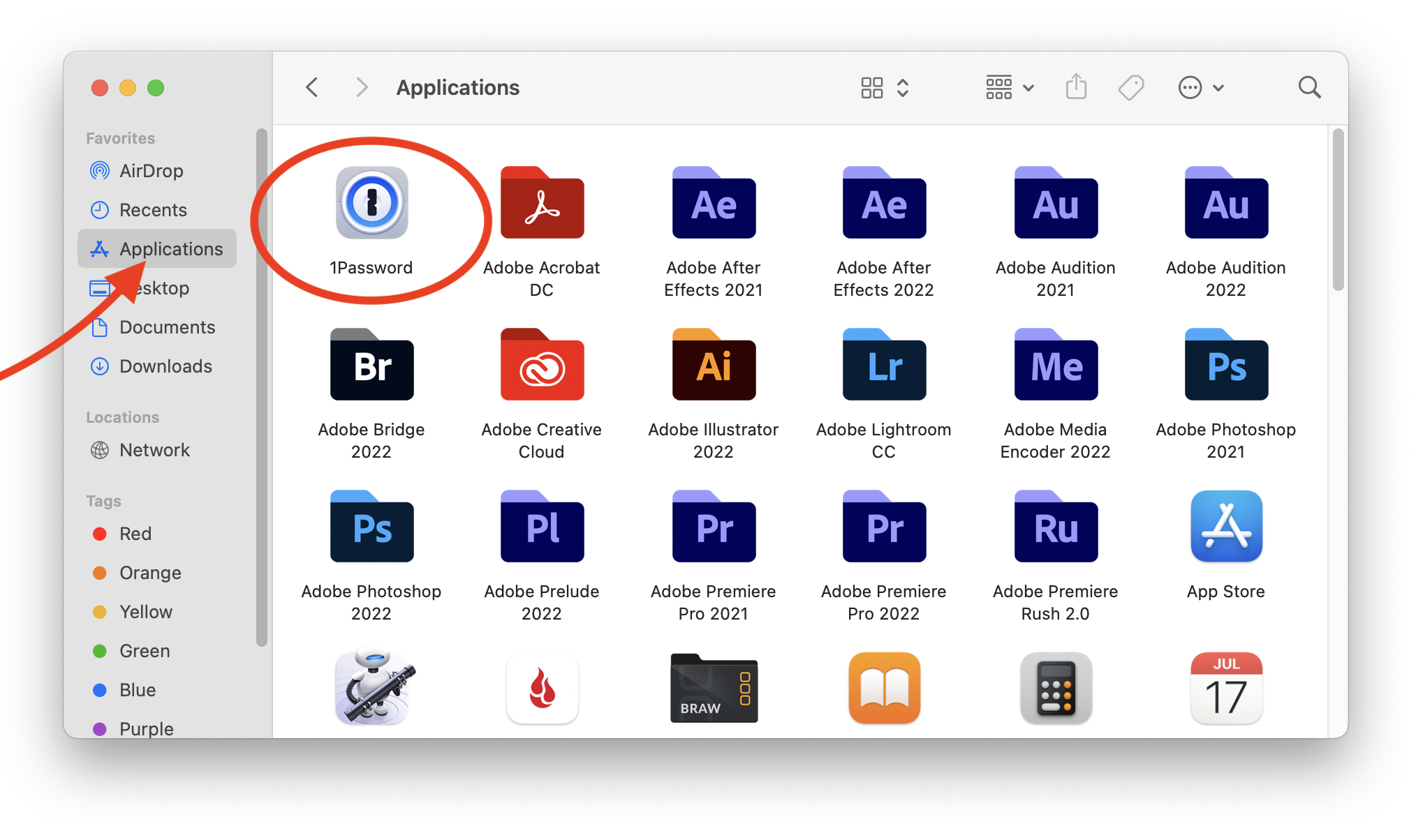 - Open Finder, click on the Applications heading, and 1Password should be in your installed applications folder.
