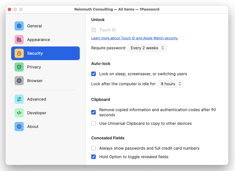 * Security Tab * Touch ID should be enabled for Mac ✅ * Auto-Lock: * Check ✅ `Lock on sleep...` * Set `Lock after the computer is idle...` to 8 hours. You may set a more strict time such as 4 hours. * Clipboard: * Check ✅ `Remove copied information...` * Uncheck 🔲 `Use Universal Clipboard...` * Concealed Fields: * Uncheck 🔲 `Always show passwords...` * Check ✅ `Hold Option to toggle revealed fields`* General Tab * Default Vault * `Save new items in:` should be set to your _named vault_ e.g. `Brook Reinhard`. It should not be set to "Private" or "Suggest a vault".