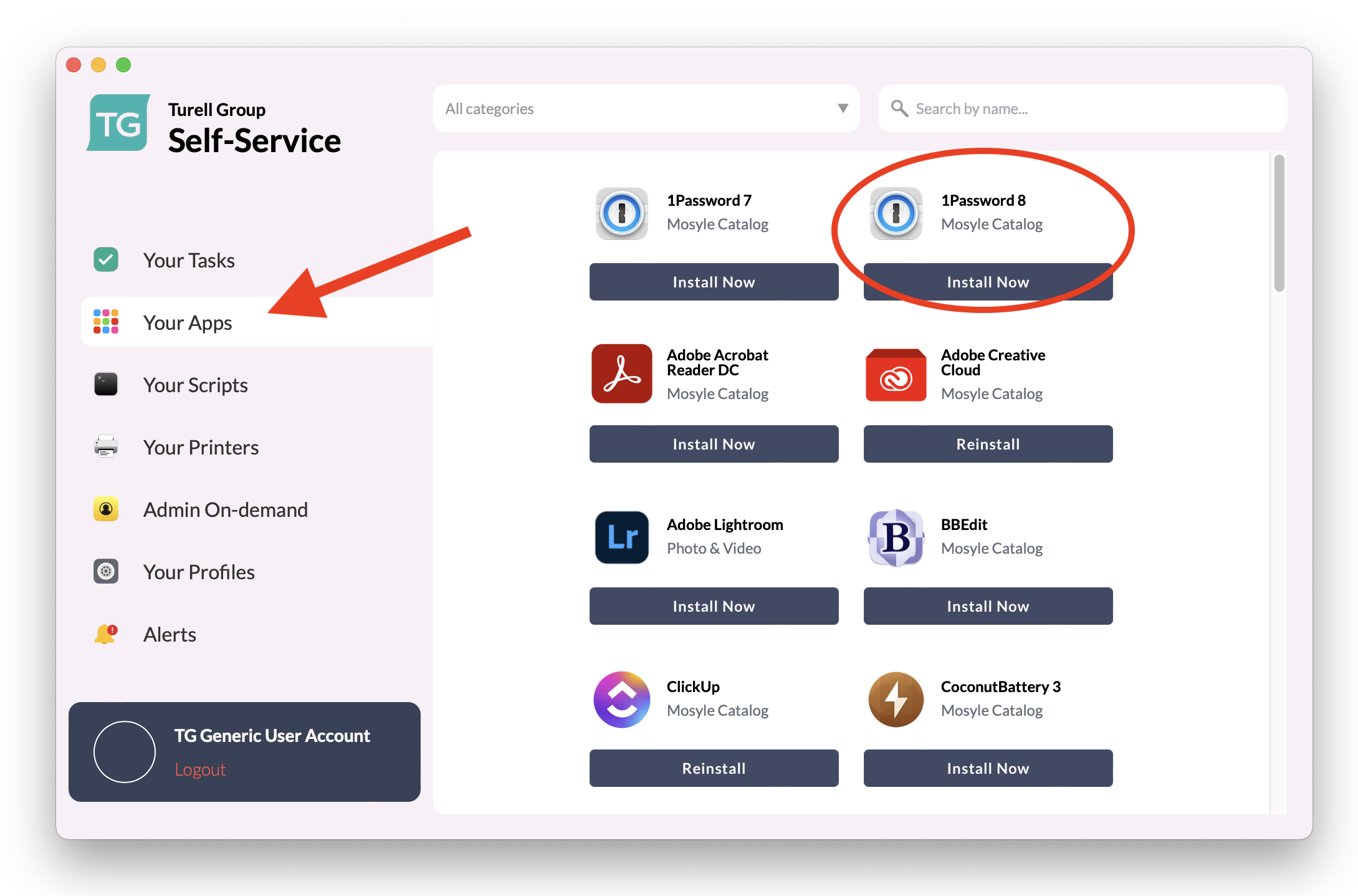 Once the Self-Service app is running, click the Your Apps tab. 1Password 8 should appear at the top. If it's not there, scroll until you find it or search by name.