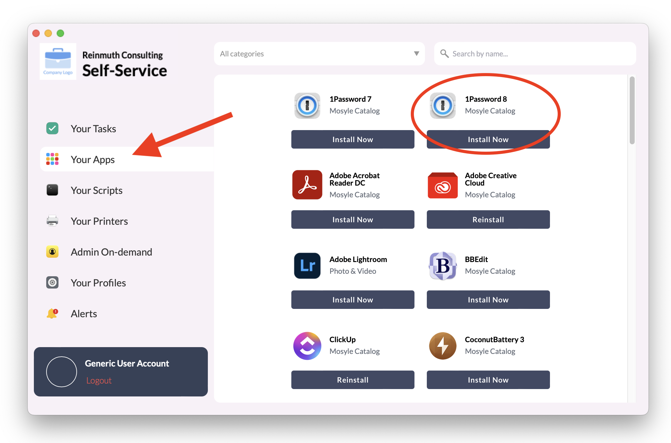 ⌘+).Once the Self-Service app is running, click the Your Apps tab. 1Password 8 should appear at the top. If it's not there, scroll until you find it or search by name.