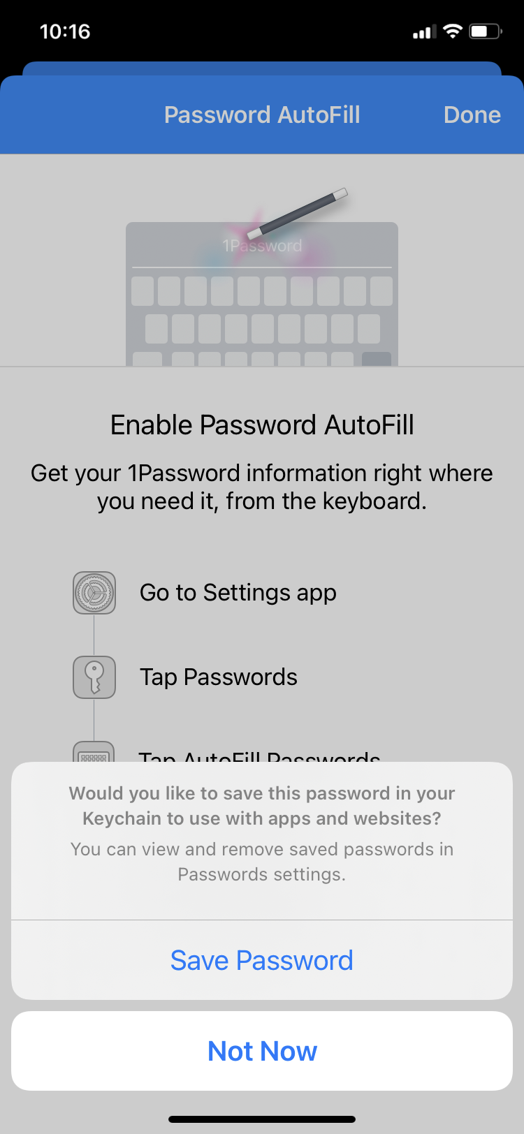 Please choose Not Now - we don't want the 1Password password saved anywhere else. Having access via your phone and your computer, mostly via biometric authentication, should be enough to provide any password at any time. Continue with the other directions shown here: