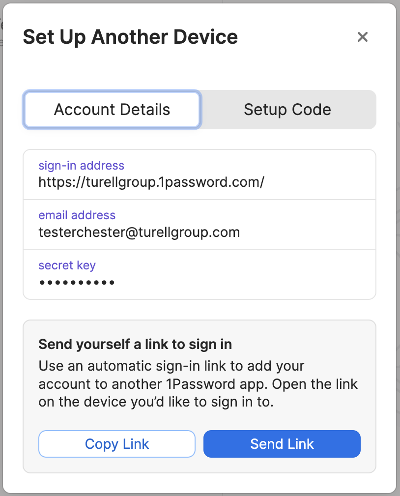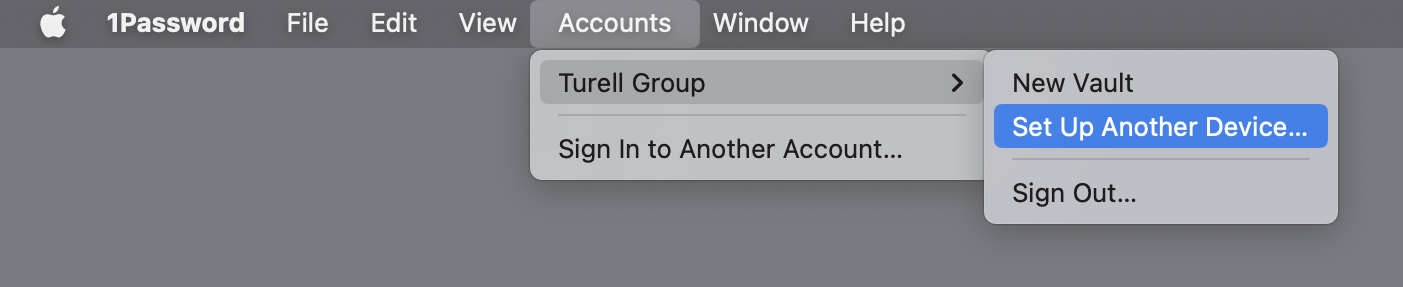 ➝ Set Up Another Device... menu option and click it.Your AccountAccount/Company NameThen in the 1Password app window, a popup should have appeared.
