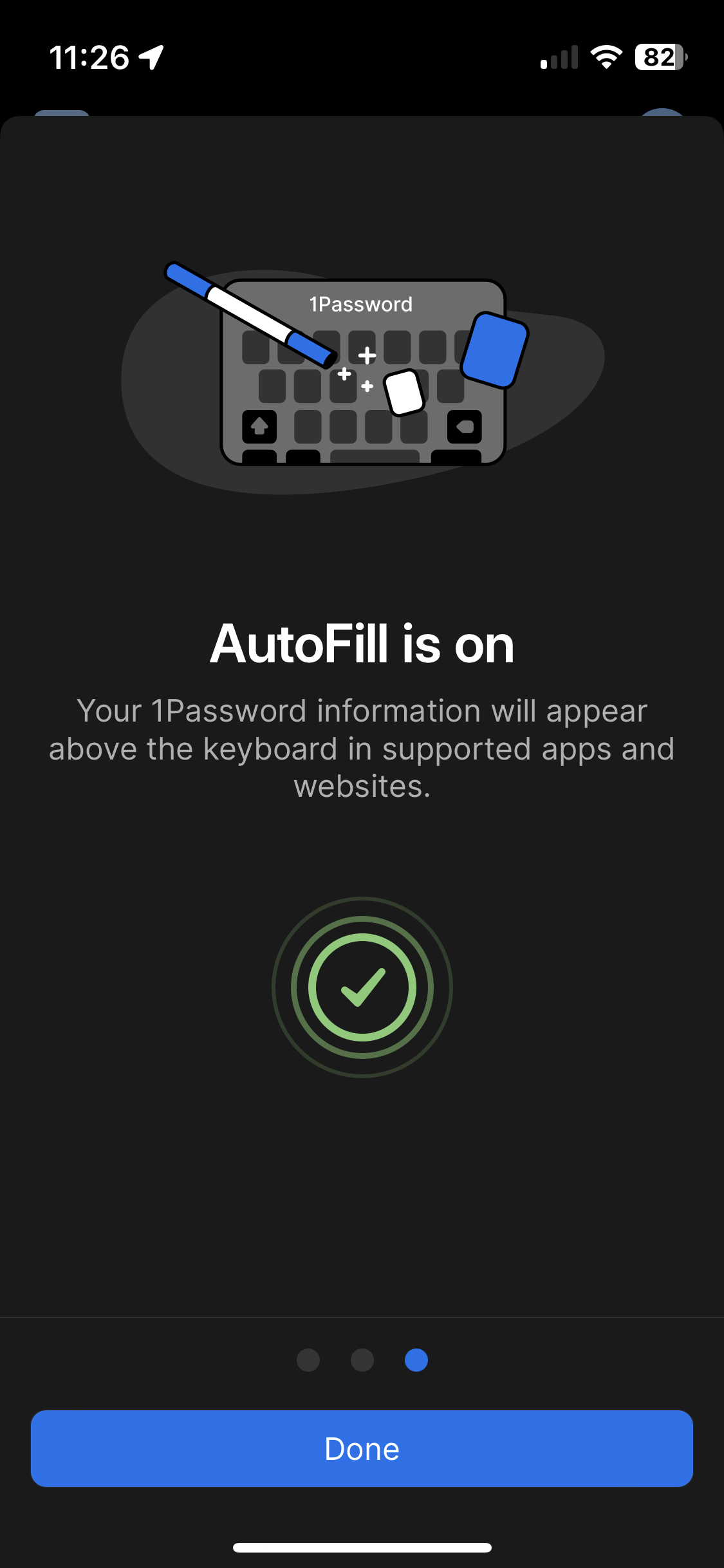 If you don't want to set up AutoFill now, hit Skip to continue. However, if you correctly enabled AutoFill for 1Password in your iPhone's settings, you should see confirmation of this back in the 1Password app. Hit Done and... you're almost done!